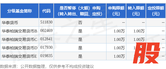本站消息,11月11日华泰柏瑞基金管理有限公司发布《华泰柏瑞交易型货币市场基金B类基金份额、C类基金份额、D类基金份额和E类基金份额调整机构投资者大额申购及大额转换转入业务金额限制的公告》。公告中提示,为保证基金的平稳运作,维护基金持有人利益,自2025年11月12日起华泰柏瑞交易型货币市场基金B类基金份额、C类基金份额、D类基金份额和E类基金份额调整机构投资者大额申购及大额转换转入业务金额限制,申购、转换转入上限金额为1.0万元,下属分级基金调整明细如下:
