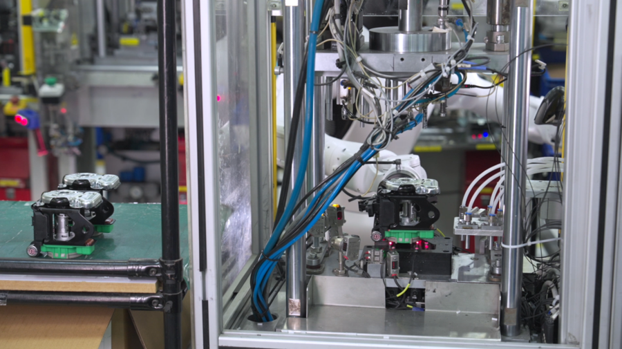 智元精灵G2正将汽车安全带锁芯送入压紧机